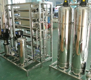 工藝流程:原水箱→原水增壓泵→多介質(zhì)過濾器→活性炭過濾器→阻垢系統(tǒng)→保安過濾器→一級高壓泵→一級反滲透系統(tǒng)→二級高壓泵→二級反滲透→純水池